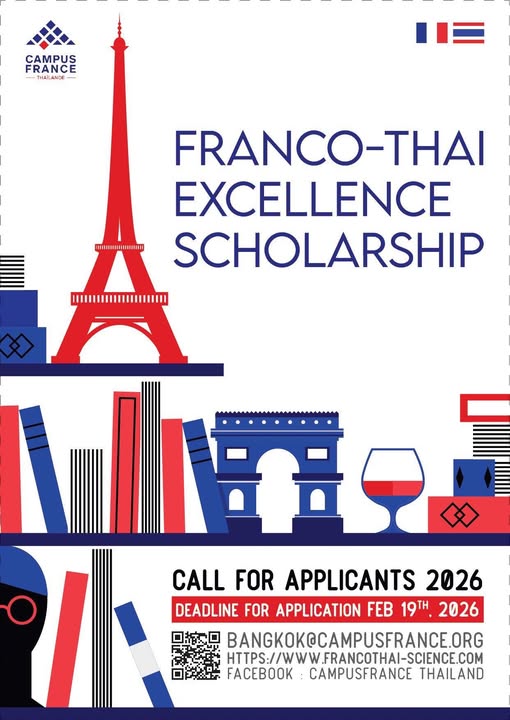 สถานเอกอัครราชทูตฝรั่งเศสประจำประเทศไทย เปิดรับสมัคร ทุน Franco–Thai Scholarship Program เพื่อสนับสนุนนักศึกษาไทยที่มีศักยภาพและมีความมุ่งมั่นในการศึกษาต่อระดับ ปริญญาโท (Master’s Degree) หรือ ปริญญาเอก (PhD) ณ มหาวิทยาลัยหรือสถาบันอุดมศึกษาในประเทศฝรั่งเศส โดยมีวัตถุประสงค์เพื่อส่งเสริมการแลกเปลี่ยนทางวิชาการระดับสูง และกระชับความร่วมมือด้านการศึกษาและการวิจัยระหว่างประเทศไทยและสาธารณรัฐฝรั่งเศส โดยมีรายละเอียดดังนี้