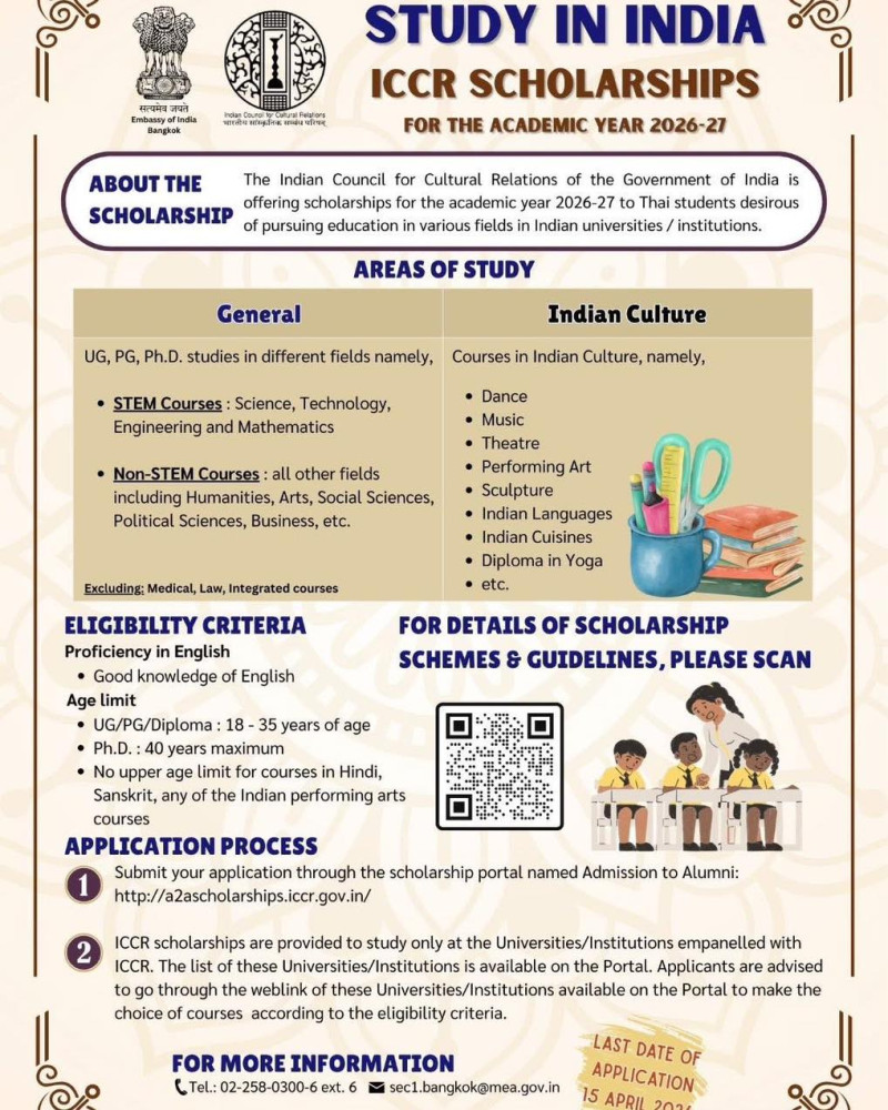 สถานเอกอัครราชทูตอินเดียประจำประเทศไทย ขอเชิญนักศึกษาไทยสมัครรับทุนการศึกษา ภายใต้โครงการของ Indian Council for Cultural Relations (ICCR) ซึ่งเป็นทุนจากรัฐบาลอินเดีย เพื่อเปิดโอกาสให้ได้ศึกษาต่อในมหาวิทยาลัยชั้นนำของประเทศอินเดีย ในระดับปริญญาตรี โท และเอก (สายวิจัย)